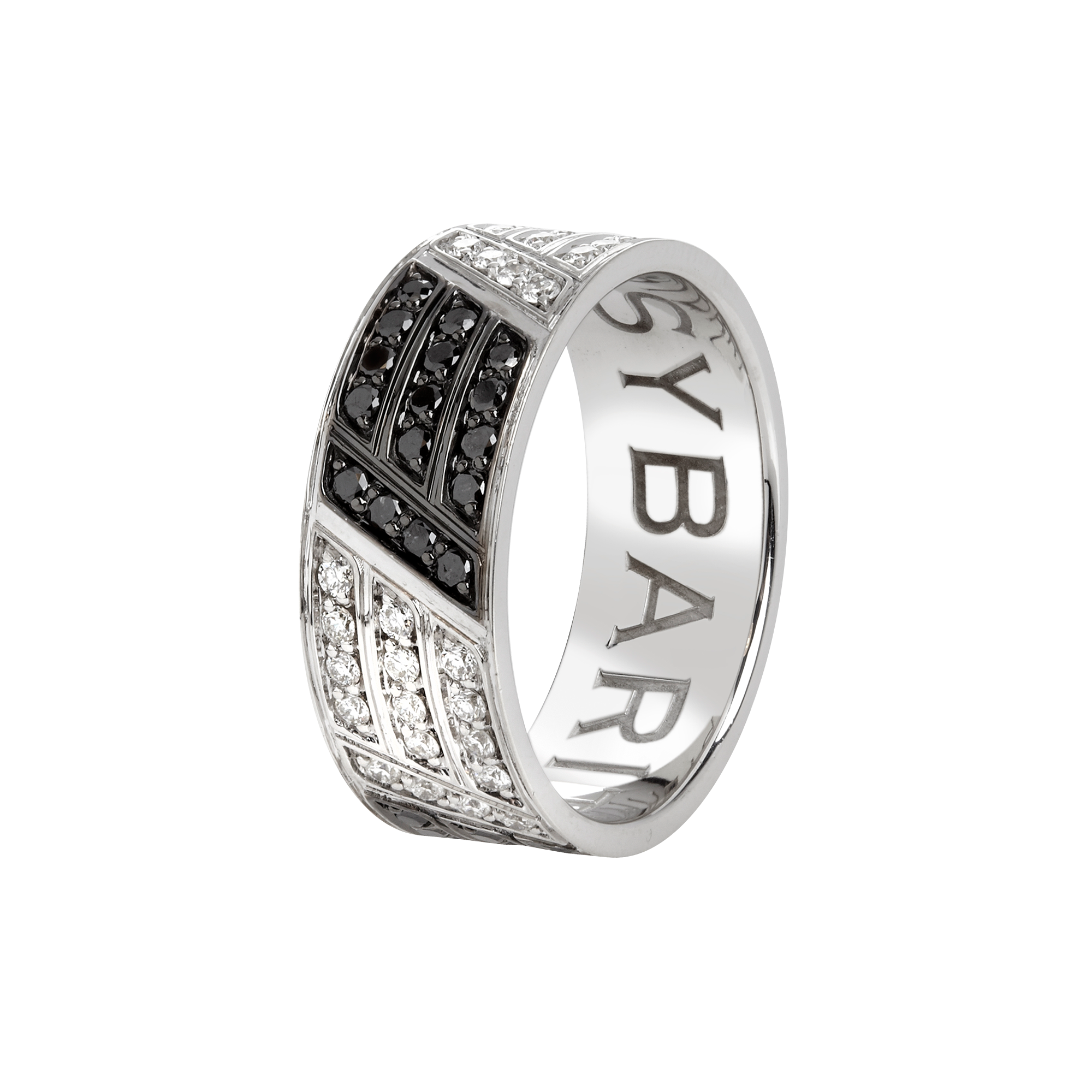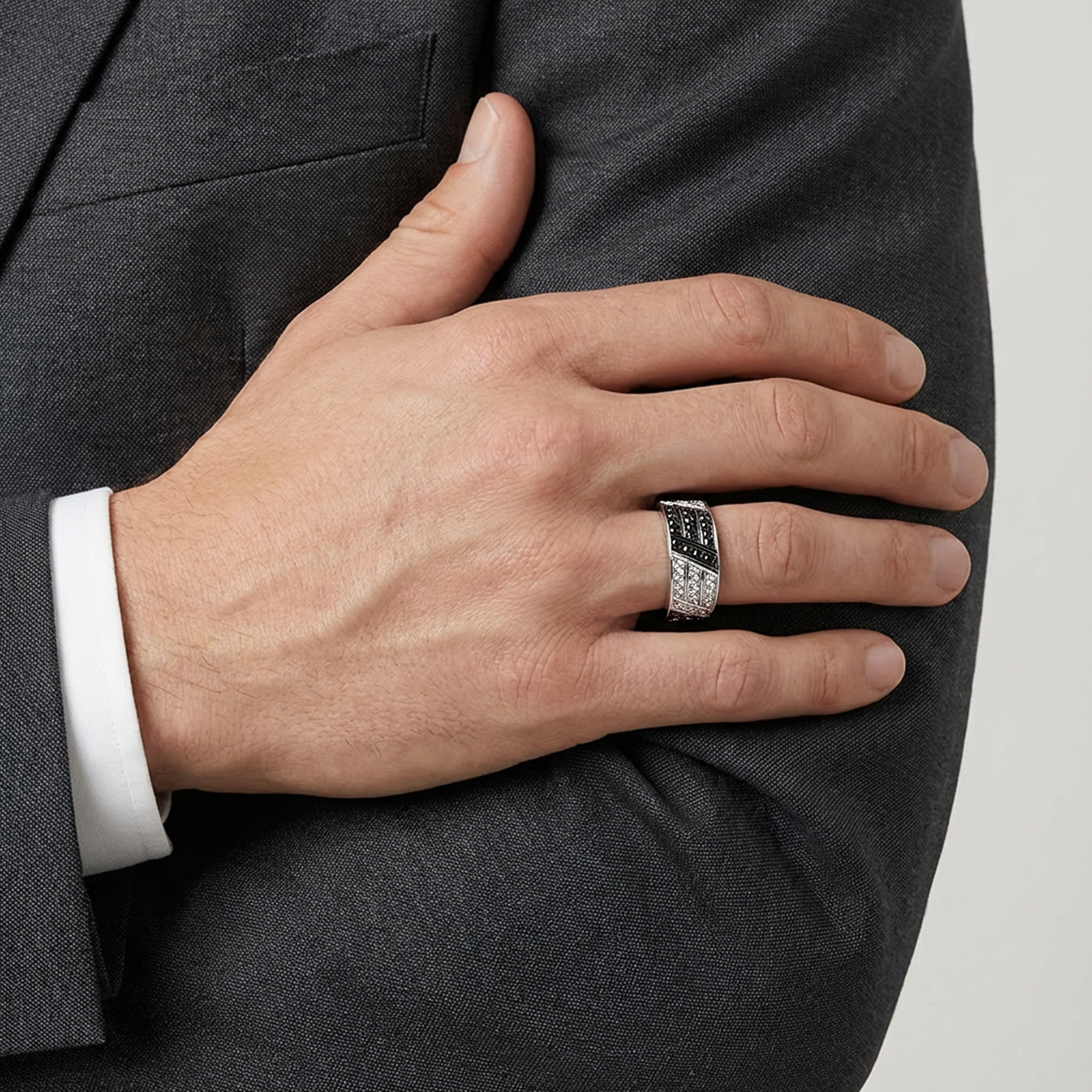 Designed for the modern man, this ring symbolises duality and inner power. The contrast between the deep intensity of black diamonds and the brilliance of white diamonds creates a bold yet elegant rhythm across the band. Each stone is meticulously set to enhance durability while delivering exceptional sparkle from every angle. The polished 18k white gold base adds a clean, contemporary finish that feels substantial and confident on the hand.