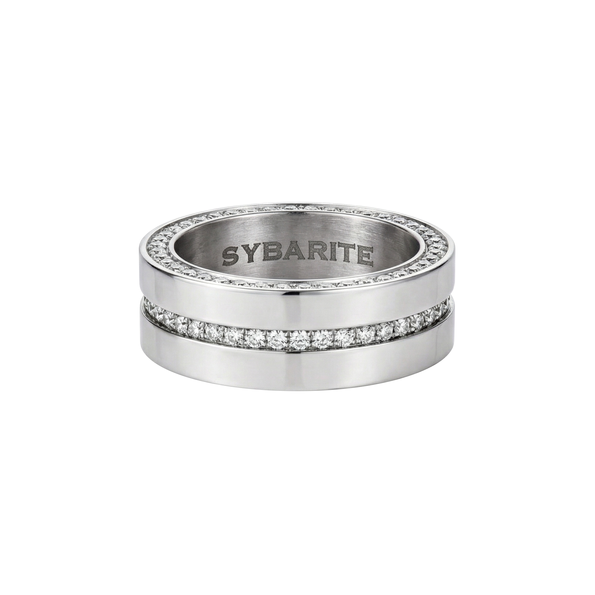 Crafted in solid 18k white gold, the ring features a concealed rotating mechanism that allows the centre band to shift effortlessly. With a single, deliberate movement, the ring transforms from a refined row of white diamonds to a striking line of black diamonds. One ring, two distinct identities.