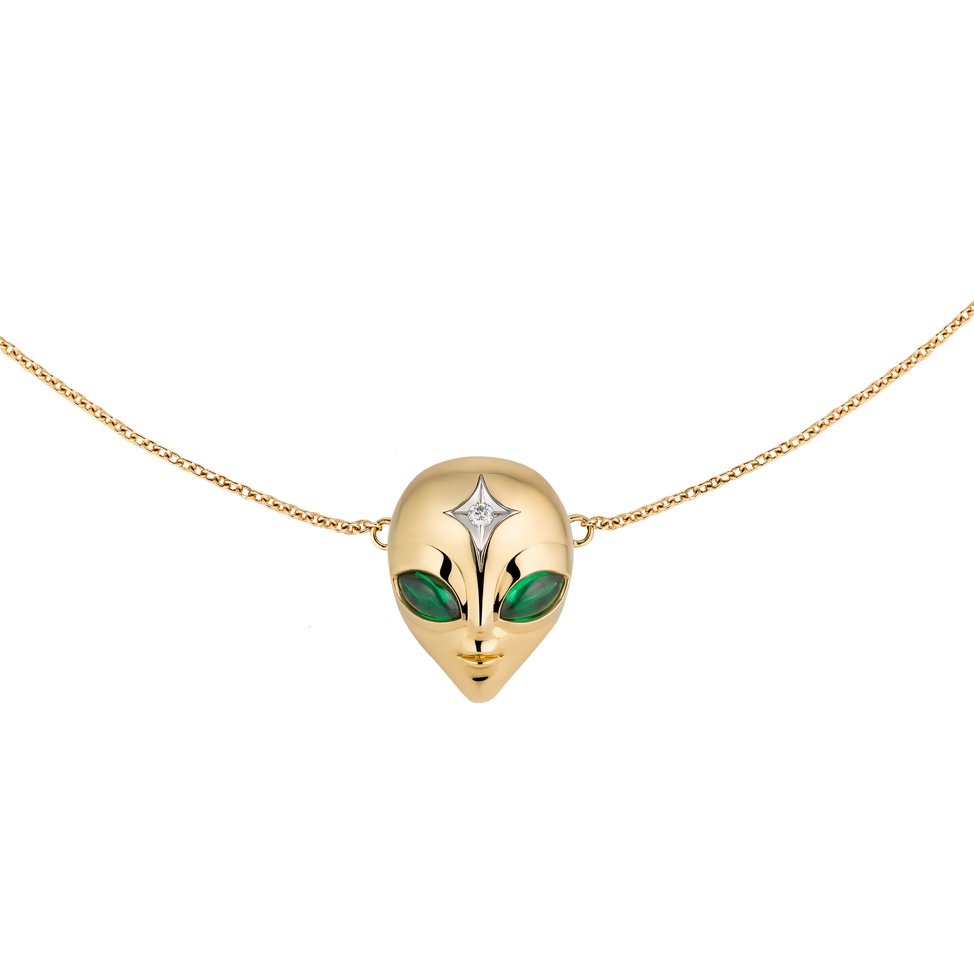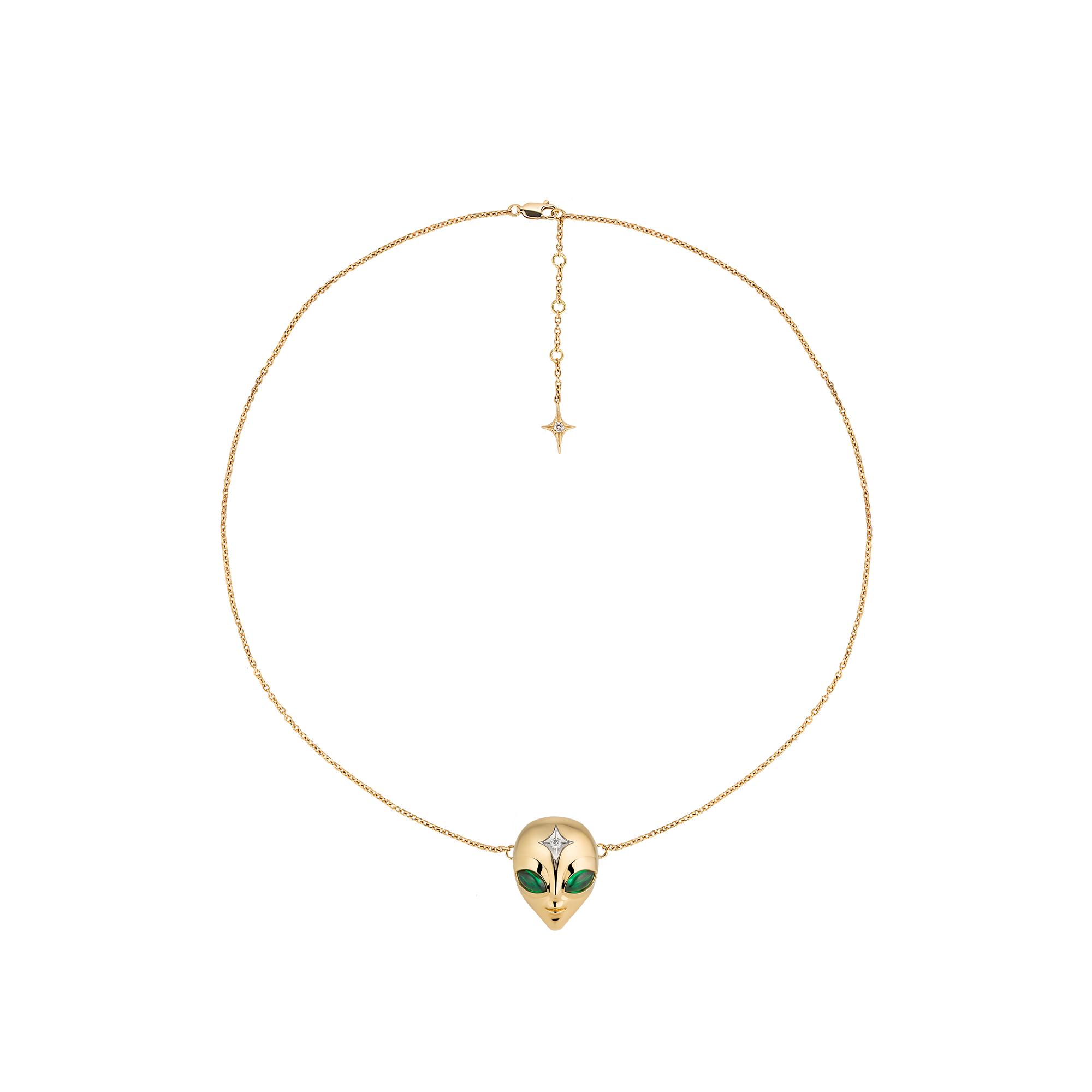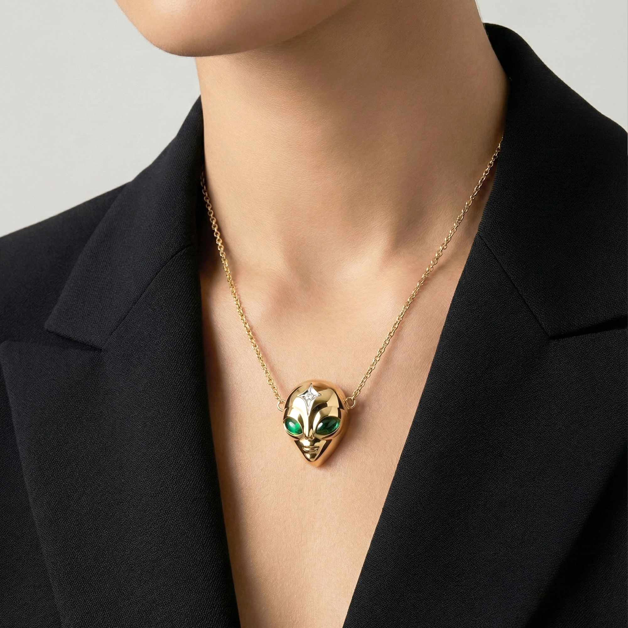 The She’s an Alien Necklace is a radiant celebration of individuality and imagination. Crafted in 18K yellow gold vermeil, this bold design features a captivating combination of sapphires and shimmering white diamonds, centered around a brilliant lab-grown sapphire that glows with cosmic intensity. With its futuristic silhouette and artistic detail, this piece embodies the mystery of the unknown and the elegance of fine craftsmanship.