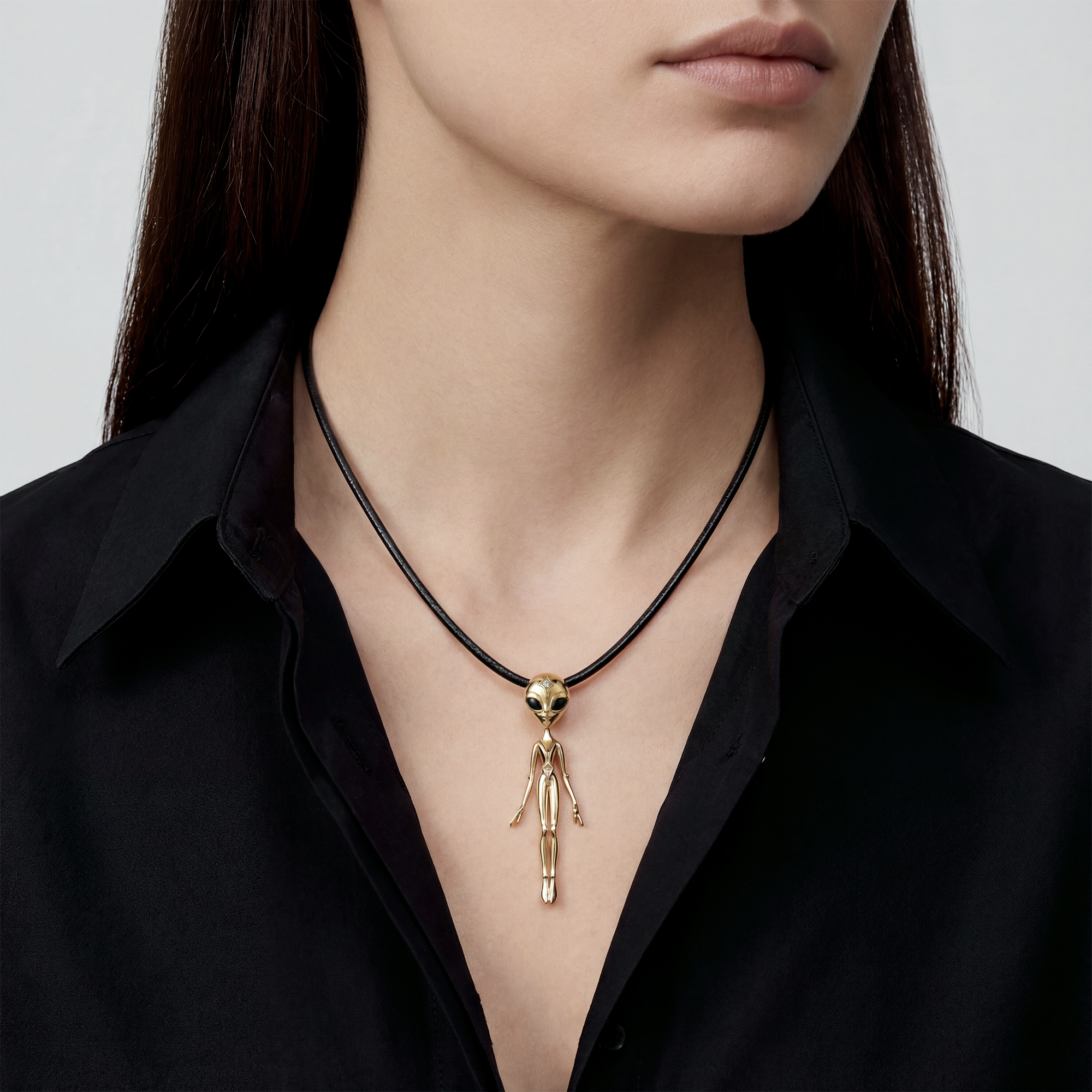 The set includes two ear wires, one alien pendant earring, a fine gold chain, and a black leather chain. Wear the alien as a statement mono earring, or transform it into a pendant and style it on either chain depending on your mood or look. The gold chain offers a refined, classic finish, while the leather chain introduces a modern, edgy contrast.