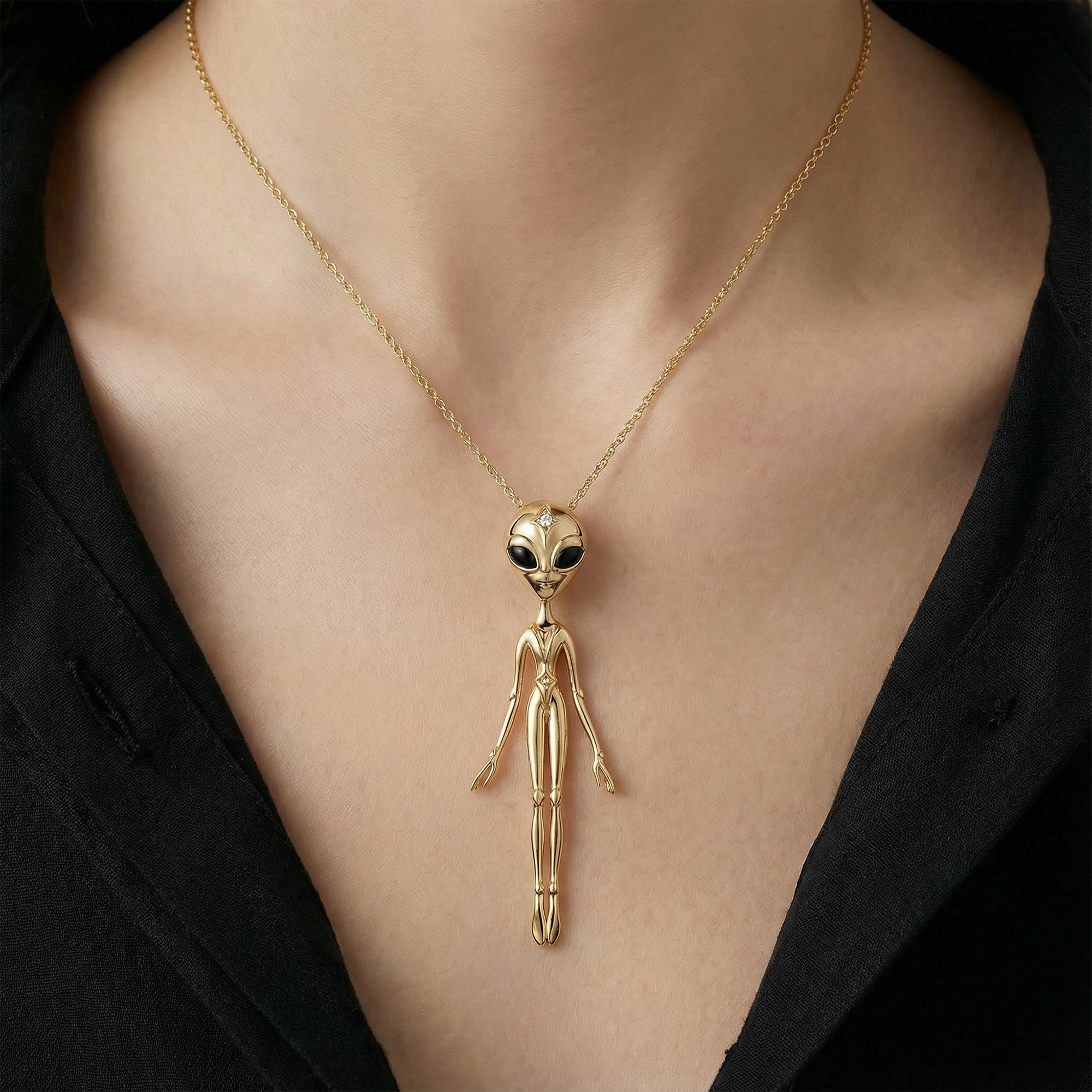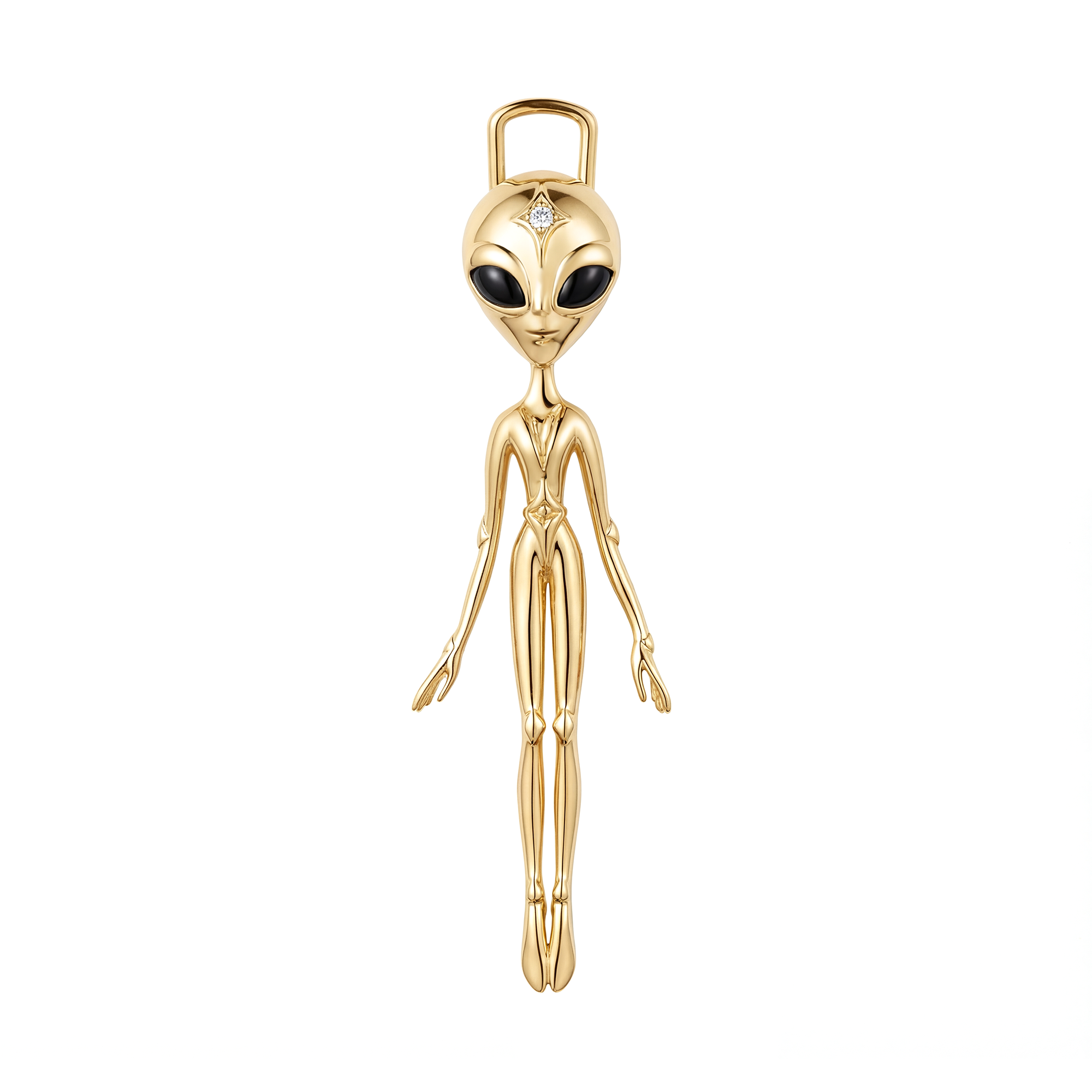 This carefully curated set brings together the iconic alien design in multiple styling options, allowing you to express your individuality in different ways. At its heart is the sculptural alien figure, defined by elongated lines, polished gold contours and hypnotic dark eyes. A delicate stone detail adds a subtle point of brilliance, enhancing the otherworldly elegance of the design.