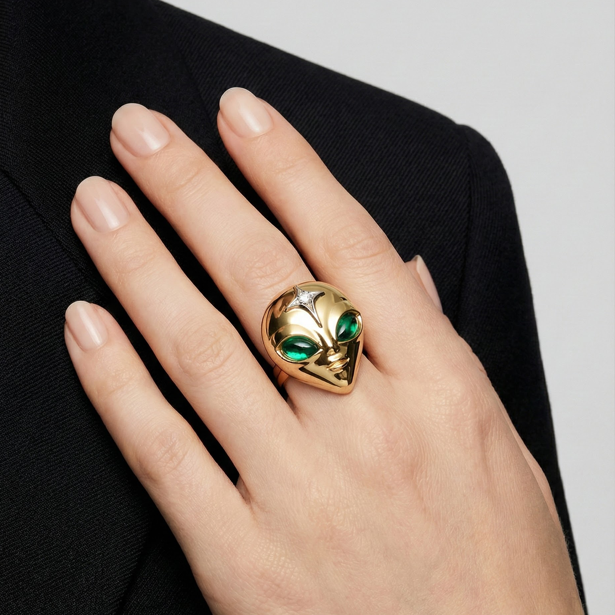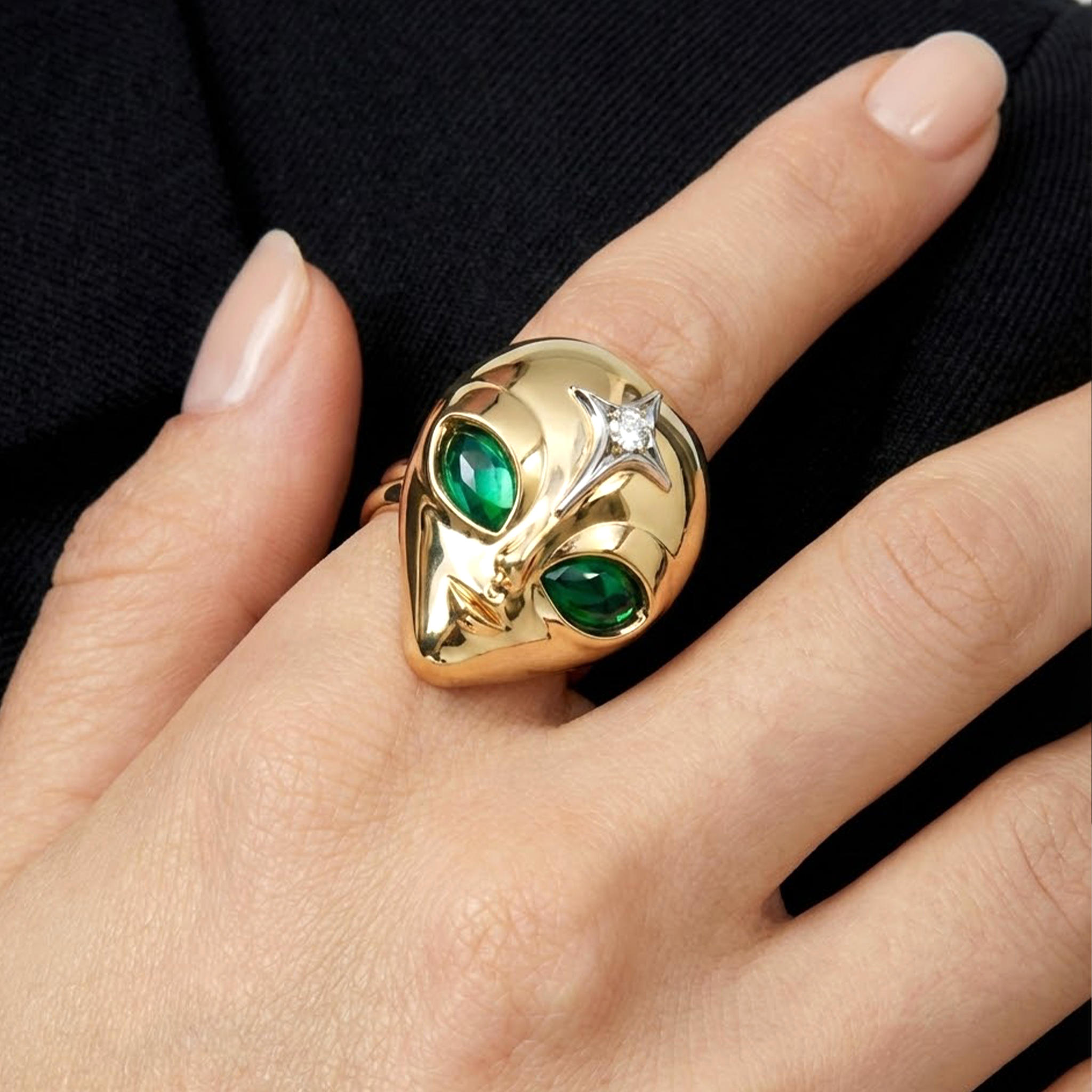 Unleash your inner icon with the She’s an Alien Ring, a bold and unforgettable piece crafted in luxurious 18K yellow gold. Featuring a vivid lab-grown emerald and shimmering round-cut white diamonds, this unique design draws inspiration from the mystery of the cosmos. A true statement of individuality and fearless style, it’s perfect for those who love to stand out. Whether you're treating yourself or searching for a meaningful gift, this ring makes a stunning choice for any occasion, a memorable birthday, anniversary, or a special surprise for your loved one.