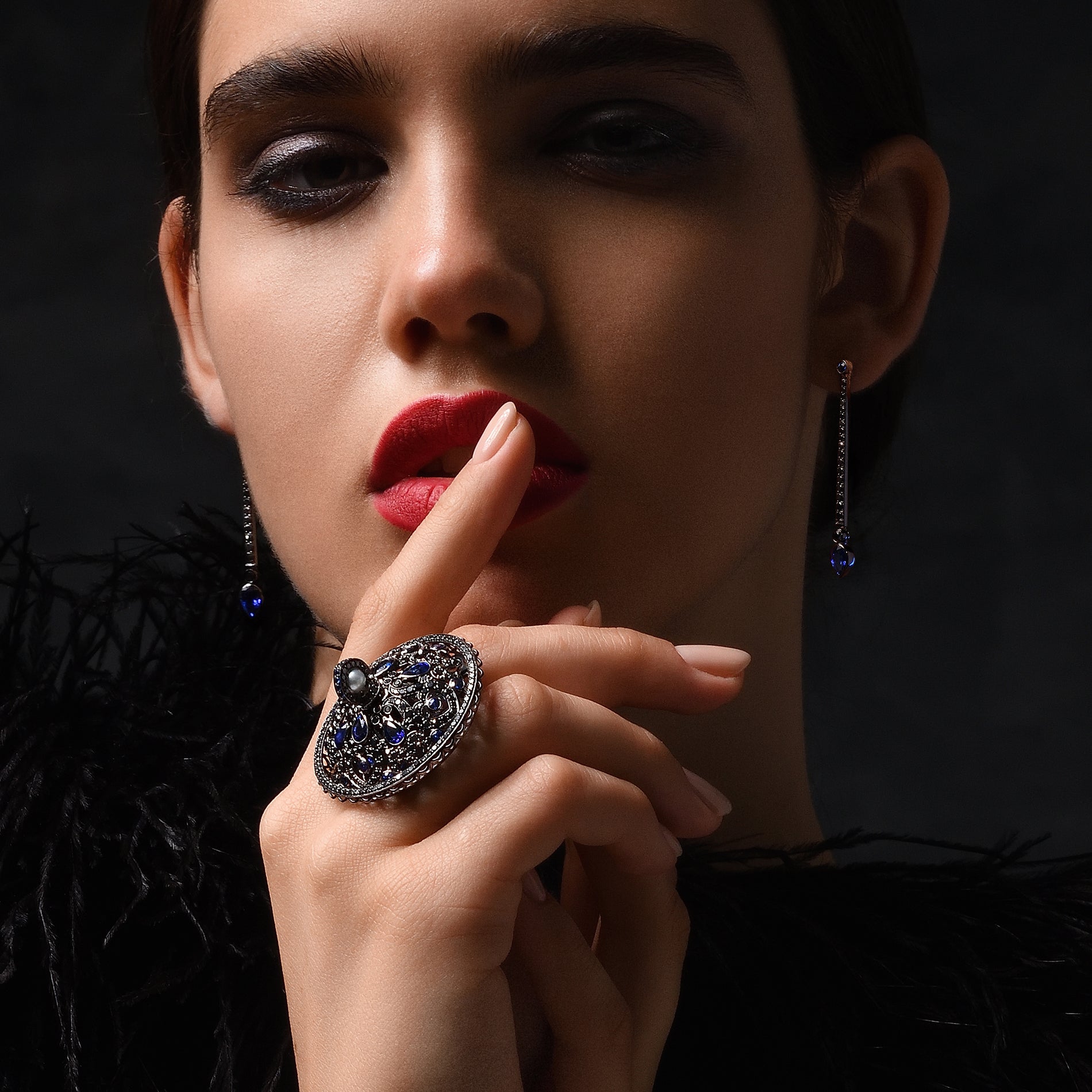 4.8 g blackened gold (18K), 1.05ct black diamonds, 1.91ct sapphires (2 PS sapphires 0.95ct each)