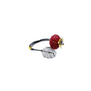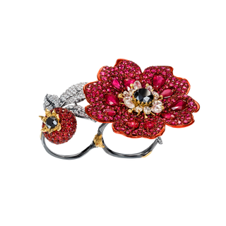 Bague Briar Rose : Or noirci (18 carats) , diamants blancs, rubis, diamants noirs.
