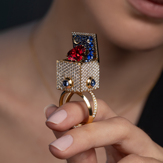 Exquisite in every detail, the outer casing sparkles with a constellation of white diamonds, while the interior gleams with vivid blue sapphires and passionate rubies – a romantic palette that adds depth and emotion to the design. Whether open to reveal its dazzling heart or worn closed in mystery, this transformable jewel is both playful and sophisticated, making it a true statement of artistry and sentiment.