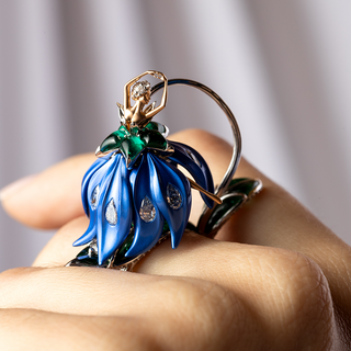 This ring captures the spirit of spring and the magic of a woodland fairy. The design was developed over three years and features a unique mechanism that gracefully transforms a bud into a flower with a subtle twist.